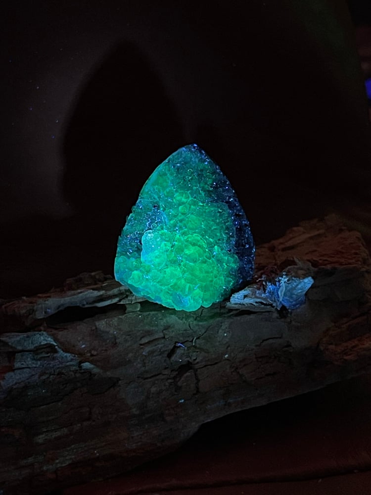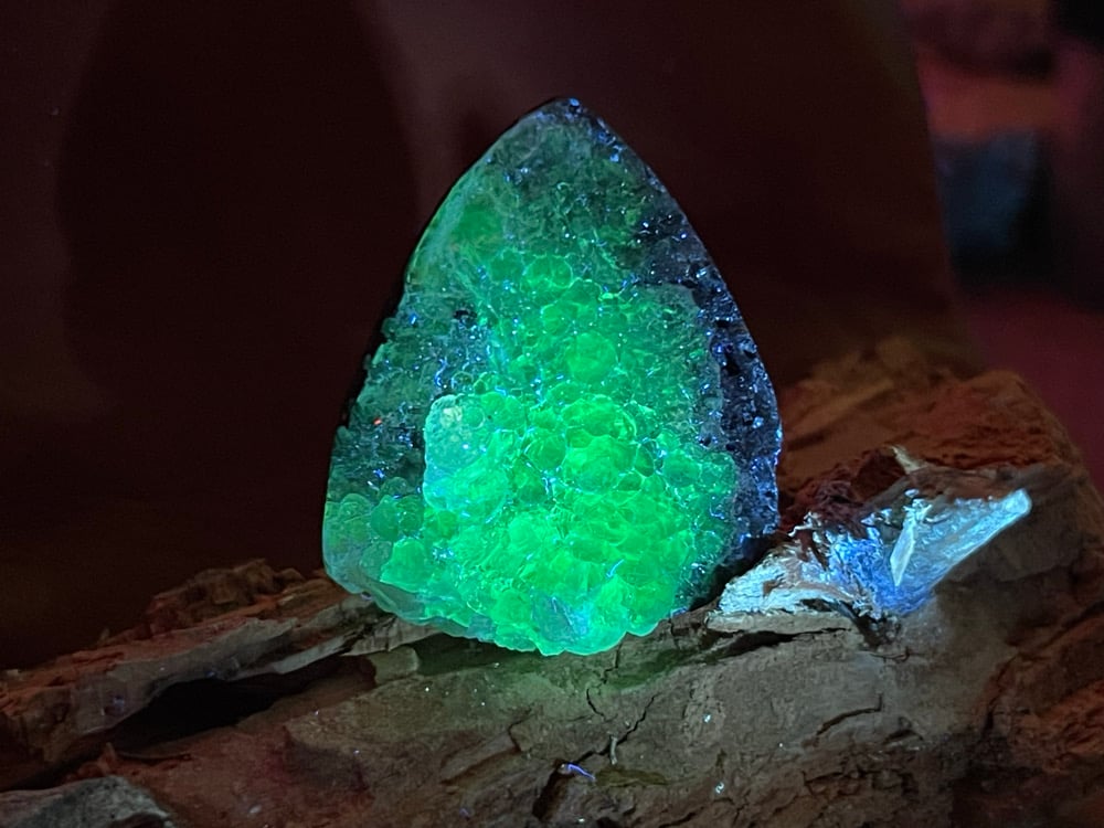 This is by far the best botryoidial Hyalite Opal cabochon backed on the natural host basalt that has been polished. This beautiful cabochon glows green in blacklight because of micro amounts of uranium in the stone. The Hyalite in Montana is around 50 million years old and coincides with the Absaroka volcanics.