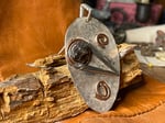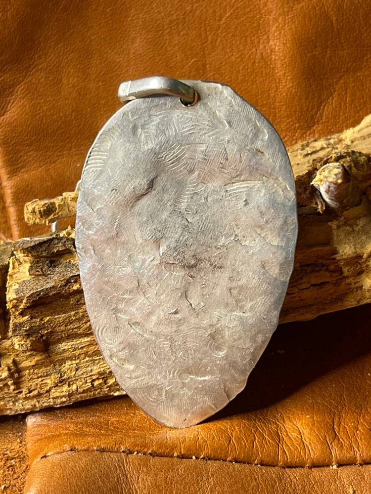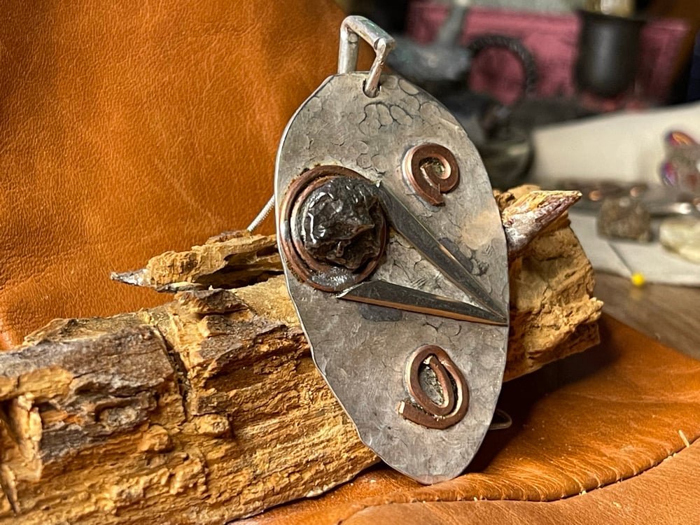 This pounded spoon pendant is the first of its kind. The copper spirals are intergalactic, the comet itself is a copper spiraling with a meteorite soldered to its surface. The tail of the comet is made from fork tines.